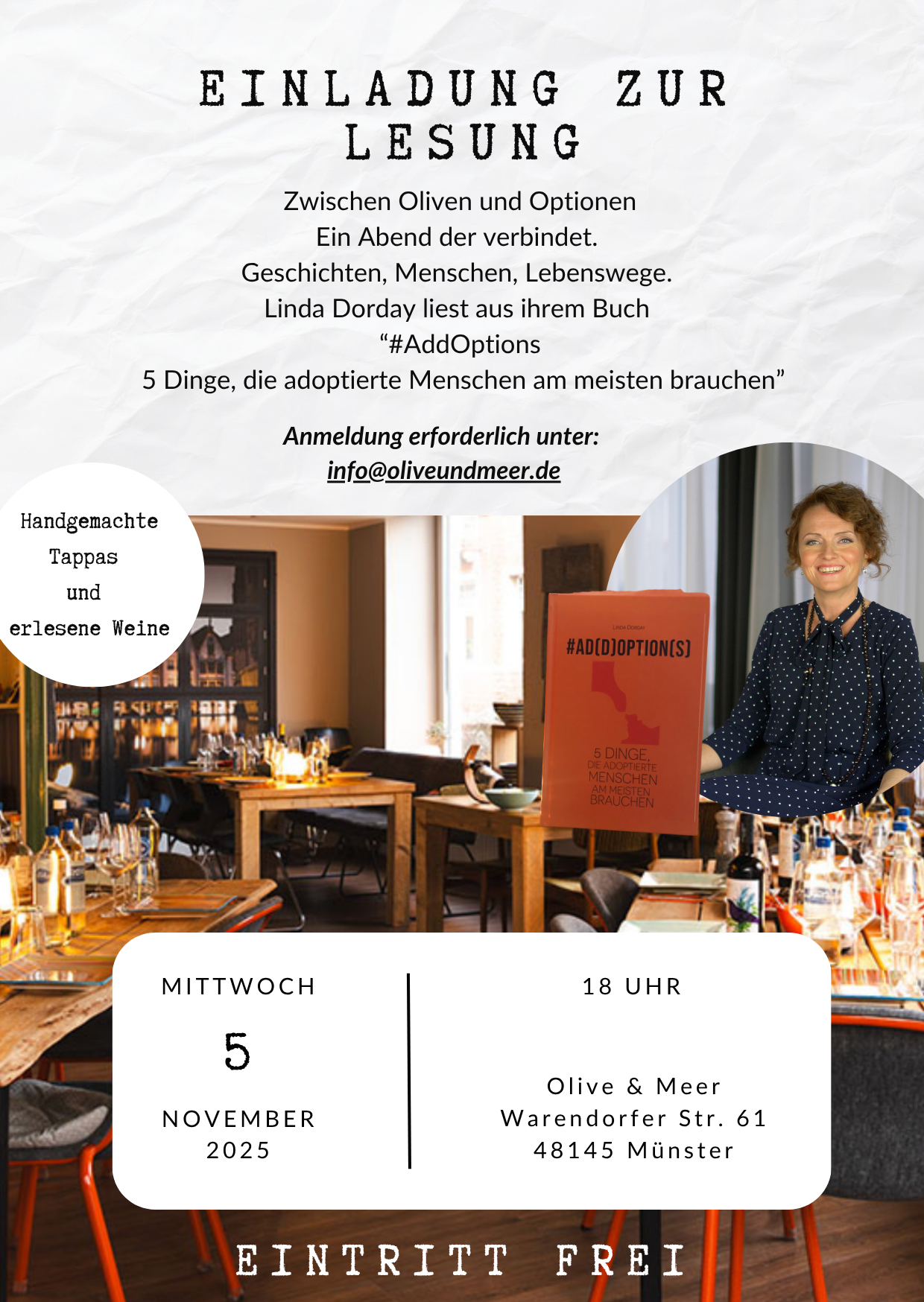 Add Option – 5 Dinge, die Adoptierte am meisten brauchen ✨ Adoption ist mehr als ein neuer Name in einer Familie. Sie prägt Identität, Zugehörigkeit und die Suche nach dem eigenen Platz im Leben – oft ein Leben lang. In diesem Buch beleuchtet Linda Dorday die fünf zentralen Bedürfnisse, die Adoptierte am meisten bewegen. Ehrlich, einfühlsam und klar zeigt sie anhand von Beispielen aus ihrem Leben als adoptiertes Kind, was Adoptierte wirklich brauchen, um zu heilen, zu wachsen und ihr volles Potenzial zu entfalten. Das Buch richtet sich an: ♻️ Adoptierte, die sich selbst besser verstehen und stärken wollen♻️ Adoptiveltern, die tiefer begreifen möchten, was ihre Kinder bewegt ♻️ Fachkräfte, die Adoption begleiten und Impulse für ihre Arbeit suchen Alle, die Adoption mit offenem Herzen begegnen wollen „Add Option“ macht Mut, eigene Geschichten anzunehmen – und eröffnet Wege zu mehr Verständnis, Verbindung und Liebe. Diese Veranstaltung wird von selbstgemachten Tapas und einer Auswahl erlesener spanischer Weine begleitet. Die Teilnehmerzahl ist begrenzt, daher empfehlen wir eine frühzeitige Anmeldung.  Der Eintritt ist frei / Der Einlass ist um 18:00 Uhr